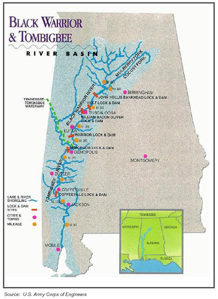 benedenloop met twee stuwen en schutsluizen (bij Demopolis en Coffeeville)